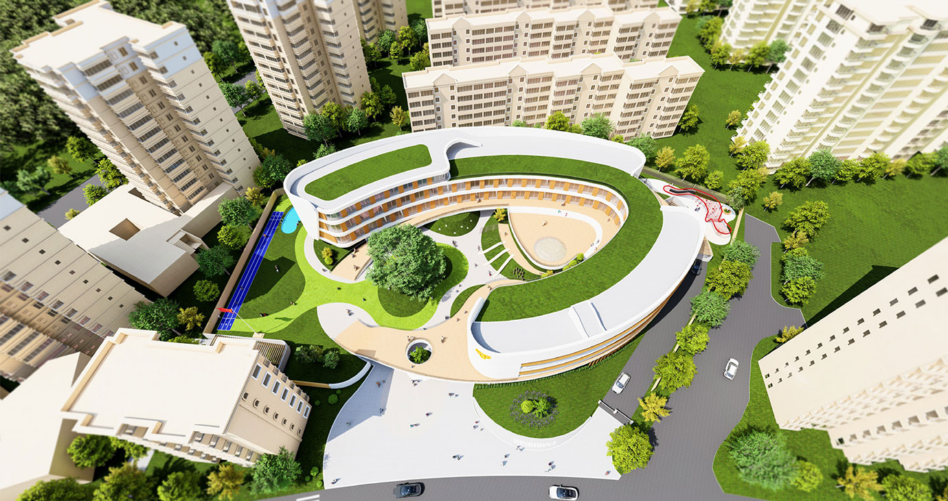 本案位于昆明市西山区,基地周边多为居住区,建筑形式、高度各异,周边环境复杂,原始场地为周边居民公共停车区域。主要要解决的问题是调和周边复杂环境,打造内敛且柔和的边界。因此,方案基调风格延续我们幼儿之城的“守护”理念,打造温柔的建筑形态,似双手环抱,表达儿童关怀和拥抱自然的情怀。