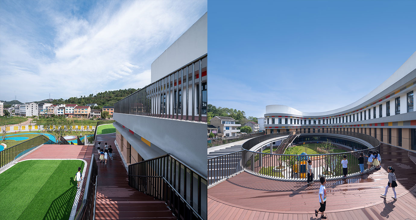 设计在原有的地貌结构不进行大调整的基础上,设计策略将园所设计成由上而下层层递退的平台,于间打造柔和环抱的中央庭院。具有延续性的绿色空间场地,是整个幼儿园与自然的连接,既改善了全园的采光环境,又赋予了孩子自然奔跑的空间。